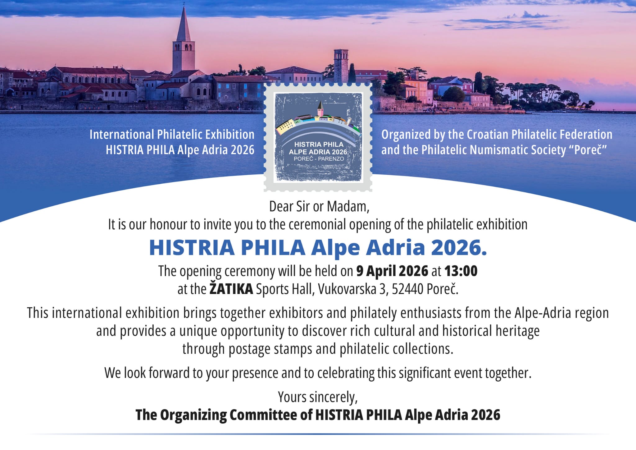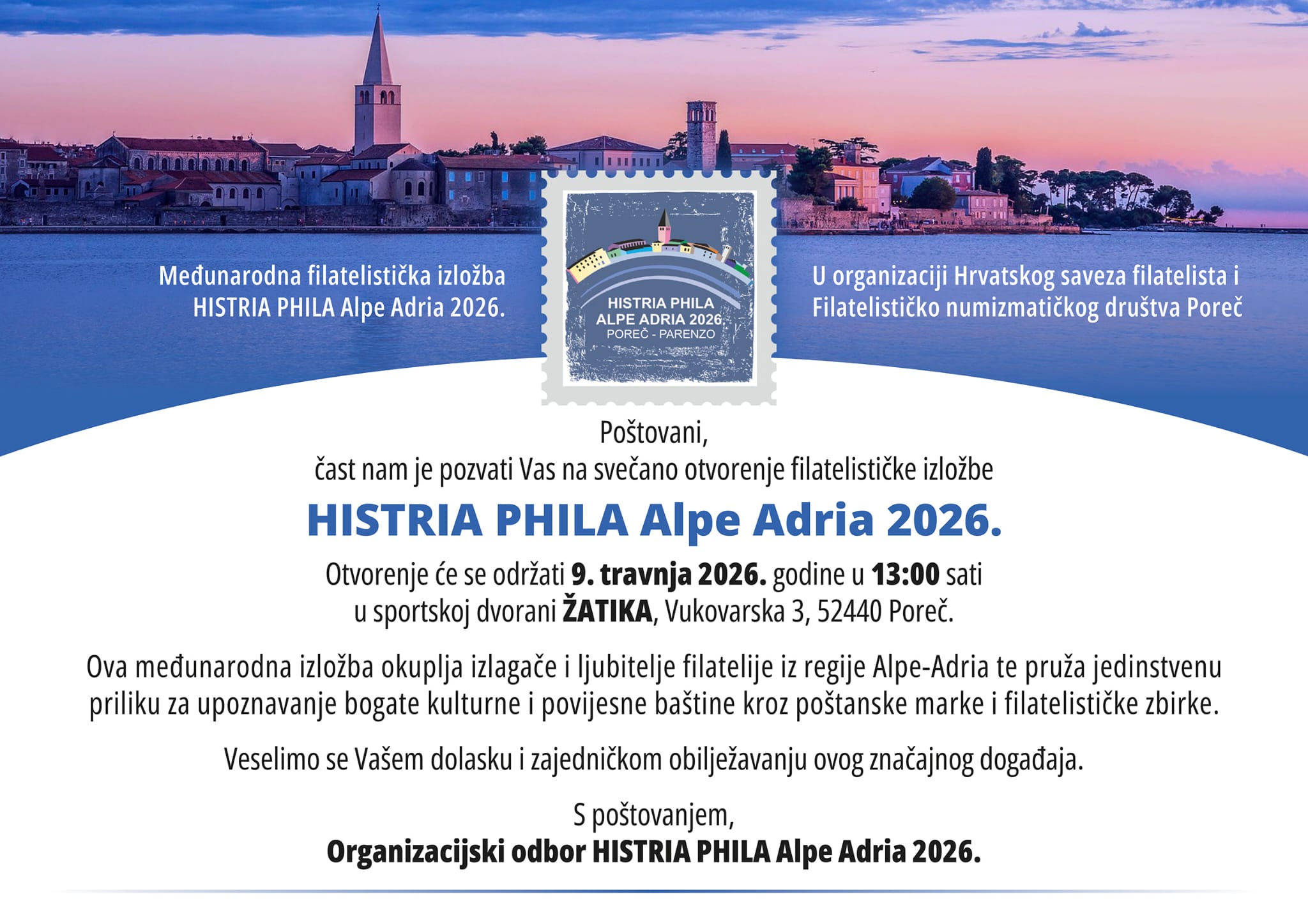 By the decision of the Board of Directors of the Croatian Federation of Philatelists, we announce the holding of the Histria Phila Alpe Adria 2026 philatelic exhibition. The exhibition will be held from 9th to 12th April 2026 In Poreč-Parenzo, a city on the Adriatic Sea on the west coast of Istria. The exhibition will be held in accordance with the usual rules of Alpe Adria exhibitions as before. Full confirmed IREX and the rest of the information will follow by the end of July. For now, we ask you (all members of the Alpe Adria Philately Group) to appoint persons who will perform the duties of commissioner and judge at the exhibition (of course, with all prescribed obligations and benefits). With the same criteria, Portuguese philatelists will also participate through their federation and we ask them to appoint a commissioner / judge. We also invite our hesitant friends from Ticino, Switzerland to appoint a commissioner and participate equally in the exhibition with all prescribed obligations and benefits. We hope that then, at the group meeting in Croatia, they will make their positive and correct final decision about AA membership. Please submit your decision to the General Commissioner of the Exhibition, Mr. Marino Banko, as soon as possible, but no later than August 31, 2025. We are at your service for any additional questions.